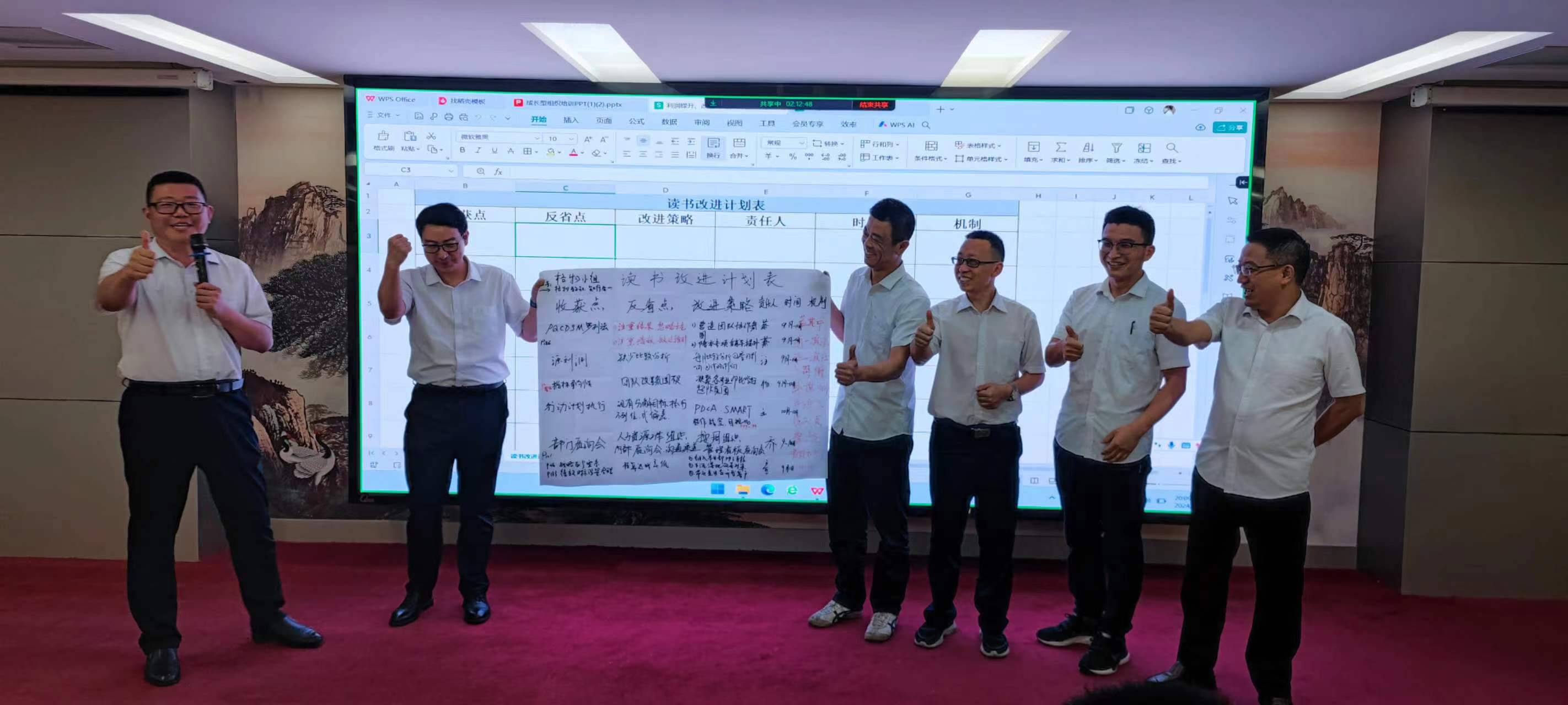 在交流環節,每個小組組長分別上臺發表感言,所思、所想、所悟,并聯系實際工作中的不足與欠缺之處,以及有待解決或尚未發現的問題,大家暢所欲言,無不盡抒。每個小組根據收獲點、反省點、改進策略、責任人、時間、機制相關內容完成了本次學習的《讀書改進計劃表》,并上臺宣讀、講解、公示。